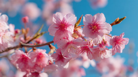 Pink cherry blossoms in full bloom against a vibrant blue sky, creating a breathtaking springtime scene. Ai generated image