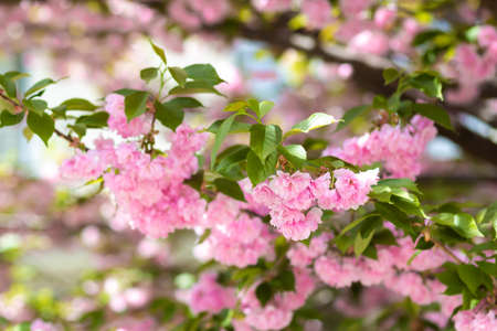 Flowers of spring pink cherry close-up on a blurred background