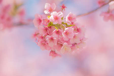 Soft focus Spring Cherry blossoms, pink flowers with blue sky.