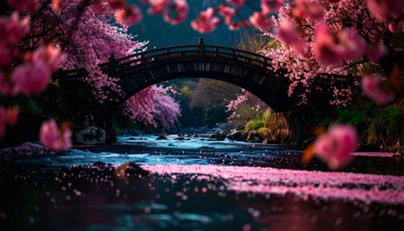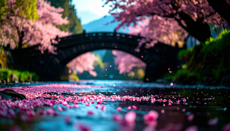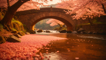 Pink sakura petals floating on serene river, ancient stone bridge in background, soft spring light, no people.