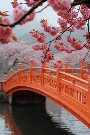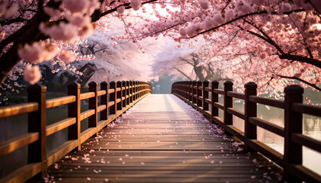 Cherry blossom covered wooden bridge natural scenery