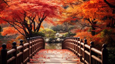 A beautiful wooden bridge stretches across a tranquil lake reflecting brilliant autumn colors from surrounding trees, creating a peaceful atmosphere.