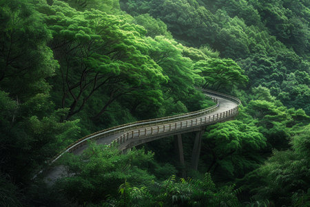 A twisting road meanders through a dense, vibrant forest with lush green foliage and towering mountains in the background.