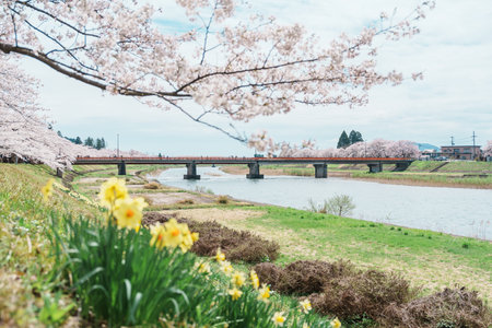Tenshochi Park along the Kitakami River in Springtime Sunny Day Morning. Rural Scene with Beauty Full Bloom Sakura Flowers. Kitakami, Iwate Iwate, Japan