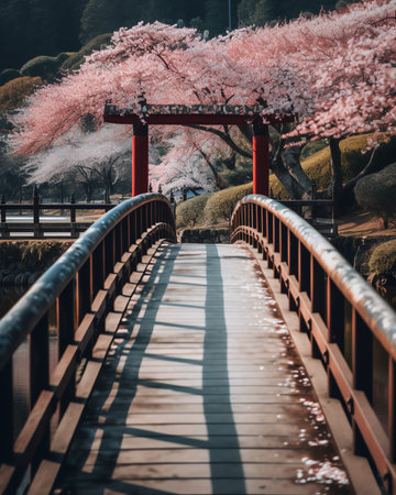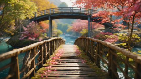 A wooden bridge stretches over a river amid lush trees in a serene setting, A serene cherry blossom garden with a small wooden bridge