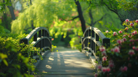 Defocused pastelcolored footbridge surrounded by lush green trees and vibrant spring flowers.