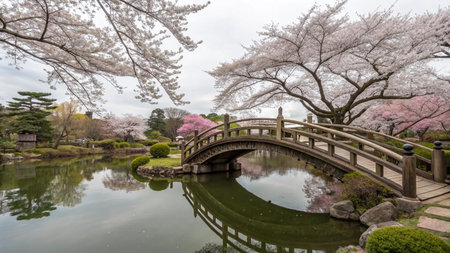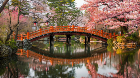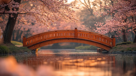 A beautiful wooden bridge arches over a calm pond, while vibrant cherry blossom trees bloom nearby, creating a peaceful and picturesque setting in a park during springtime.