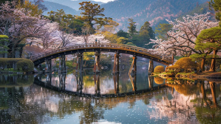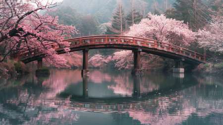 Serene Japanese Garden with Arch Bridge and Pink Cherry Blossoms Reflected