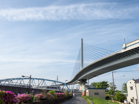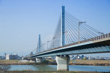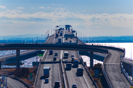 Japan. The bridge in Tokyo. Road architecture of Japan. The bridge on the background of the sky. Road bridge to the island of Odaibo. Crossing Tokyo Bay. Japan island. Landscape of the Japanese city