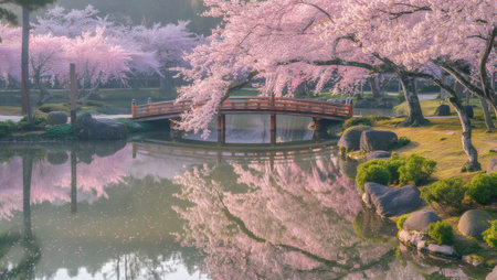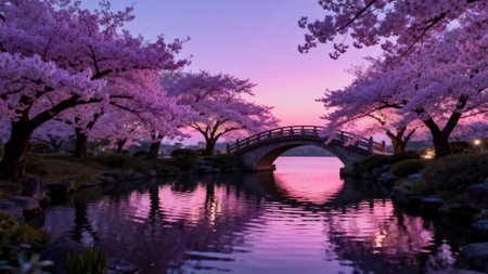 A serene pond surrounded by blooming cherry blossoms with a picturesque bridge crossing over.