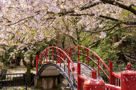 Japanese garden with cherry blossom and red bridge in spring time.