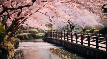 Riverside cherry blossom forest and bridge landscape