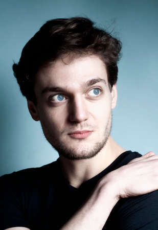 Portrait of a handsome young man with dark hair and blue eyes