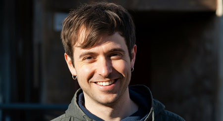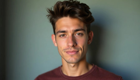 A young man stands in front of a muted wall, wearing a relaxed t-shirt. His confident gaze and gentle smile convey a sense of ease and approachability, illuminated by natural light.
