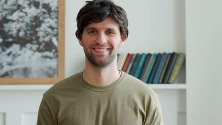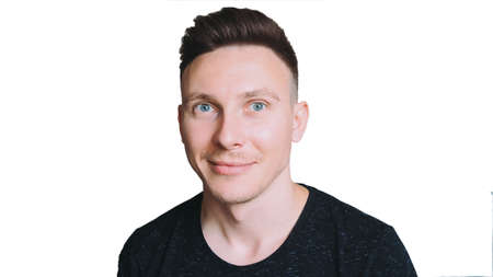 Close up portrait of smiling handsome man in white t-shirt looking at camera, isolated on gray background