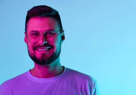 Cropped portrait of bearded man in stylish glasses smiling and looking at camera, posing isolated over blue background in neon lights