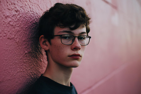 Portrait of a teenage boy in glasses on a pink background.