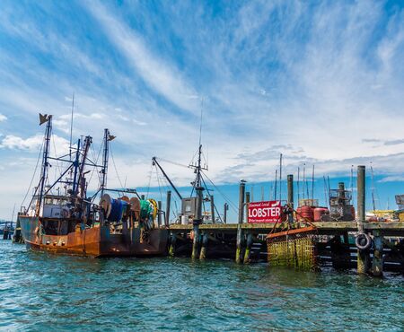Narragansett, RI / United States - Sept. 15, 2020: wide view of the pier and fishing boats of the Point Judith harbor in Rhode Island.