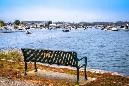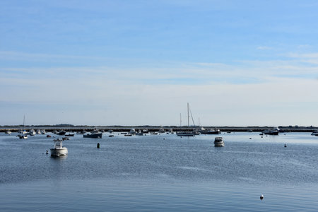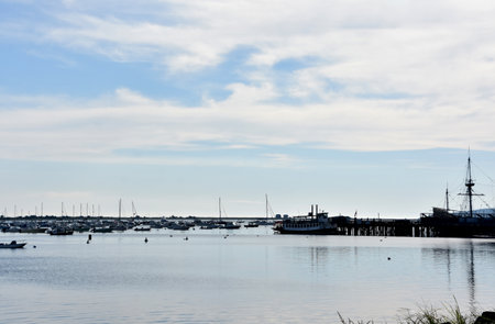 Beautiful scenic view of boats anchored in Plymouth Harbor in Massachusetts.