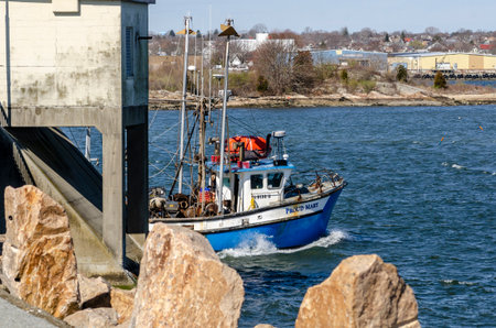 New Bedford, Massachusetts, USA - September 10, 2019: Commercial fishing vessel Bella Rose, hailing port Bass Harbor, Maine, passing New Bedford hurricane barrier on her way to sea