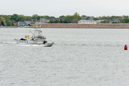 Fairhaven, Massachusetts, USA - May 18, 2020: Recreational fishing boat cruising past lobster boat Never Home in New Bedford outer harbor