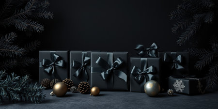A row of elegantly wrapped black gifts with ribbons and bows surrounded by Christmas ornaments and pine branches in a dark setting