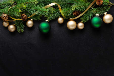 Beautiful Christmas background top view. Coniferous twigs on a black background. Christmas tree balls and juniper twigs. Stylish New Year theme