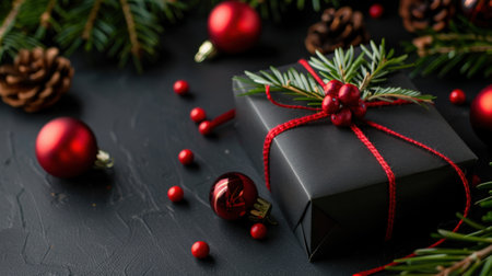A festive arrangement features a black gift box with a gold ribbon surrounded by pine branches and decorative ornaments. The dark backdrop enhances the holiday ambiance and seasonal spirit.