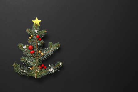 coniferous branches and Christmas tree decorations on a New Year's black background, copy space