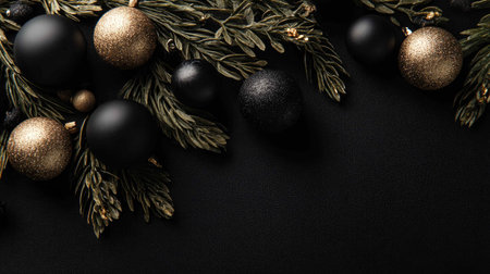 An elegant display of black and gold Christmas ornaments rests on dark green pine foliage. This seasonal composition captures the beauty of holiday decor, emphasizing luxury.