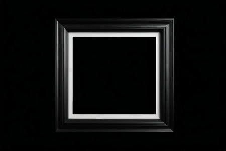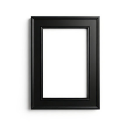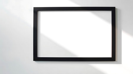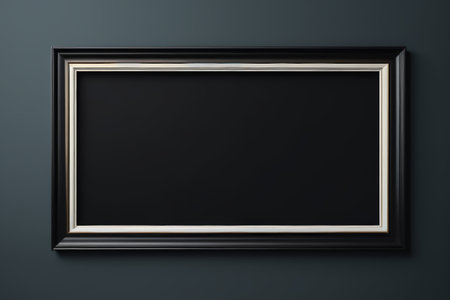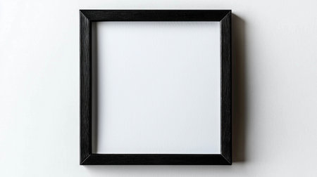 A black wooden wall art frame hanging on an empty white wall. Generative AI