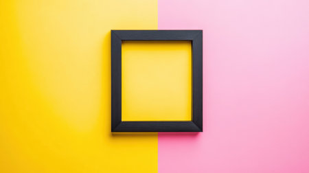 This image features a black picture frame centered on a split background of bright yellow and pink. Ideal for showcasing art and design.