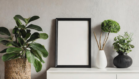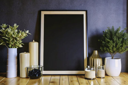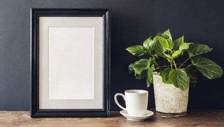 Mockup black frame vertical on the wall and plants in pot on table top at home, mock up poster for presentation on desk, your design for gallery photo and picture, border template for advertising.
