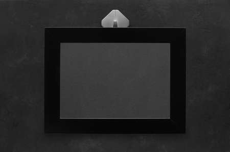 Mock up blank poster picture frame hanging on black marble wall background in room - can be used mockup for montage products display and design key visual layout.