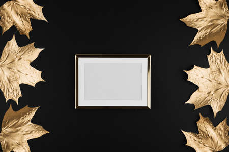 Autumn composition. Frame made of autumn golden maple leaves on black background. Flat lay, top view, copy space
