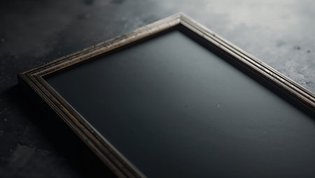 A close-up of a hand presenting an empty dark rectangular card with a light wooden frame, ideal for custom text, branding, or promotional messages.