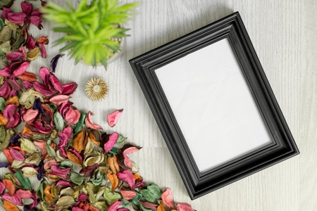 Photo frame on white wood background with potted plant and dry flower petals. Rustic nostalgia.