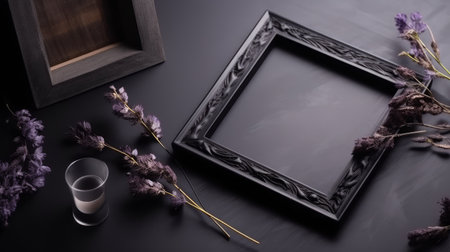Funeral, grief, black frame with flowers, created with Generative AI technology.