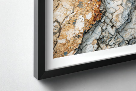 An abstract composition of natural stone textures fills the frame, creating a striking contrast with the clean white wall.