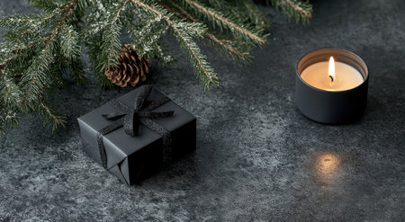 Christmas background with a black gift box, a candle, and pine tree branches on a dark grey concrete table. --ar 78:43 --v 6.1 Job ID: ed21fcd5-8dba-4ae8-beea-24cdcb7e8c10
