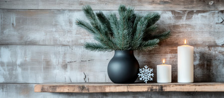 Shelf with hygge Christmas decor - pine branches, candles, vase, lights string garland, winter holidays still life in natural colors, AI generated