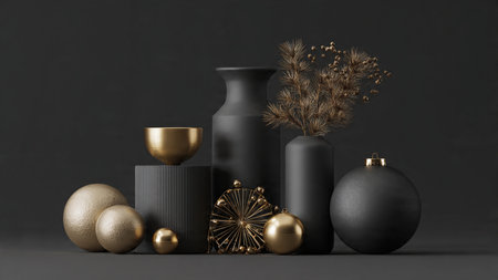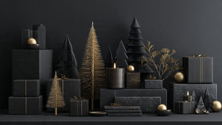 Ebony-black textures contrasted with radiant gold ornaments for a premium holiday look.