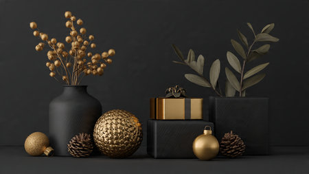 A modern holiday mockup featuring sleek matte-black textures and elegantly minimal gold elements.