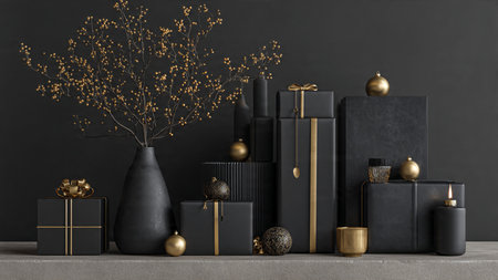 A stylish premium festive setup mixing matte-black surfaces with rich metallic gold details.