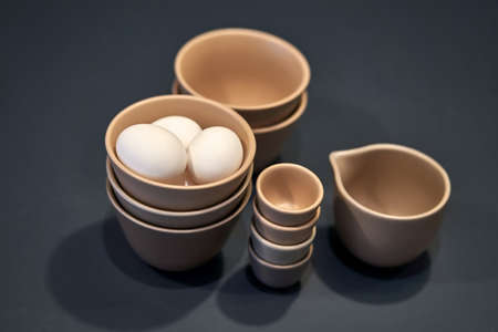 Different sizes ceramic brown bowls and a jug on the dark background in the studio. There are white eggs in the upper bowl. Closeup photo with selective focus. Horizontal.