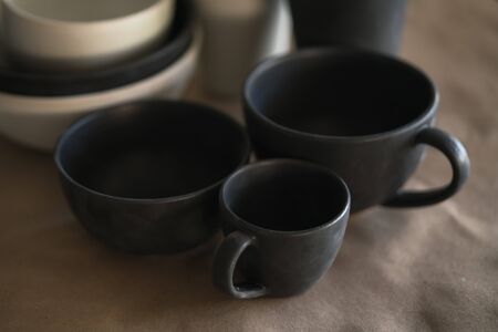 Matt ceramic handmade tableware in a workshop closeup, shallow focus