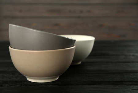 Stylish empty ceramic bowls on black wooden table, space for text. Cooking utensils