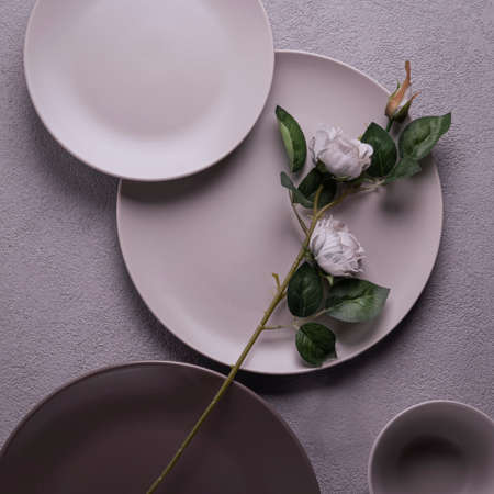 Multicolored empty ceramic plates and bowls on a marble background. Table setting. Shabby chic or retro style. Copy space. Mock up, concept for restaurant, menu.
