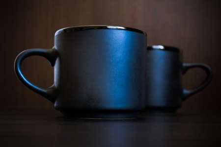 Two black coffee or tea cups on dark background