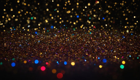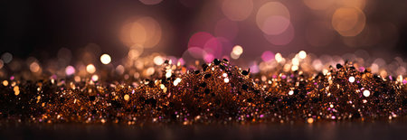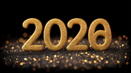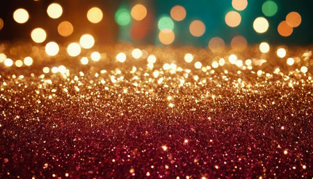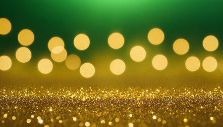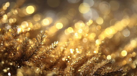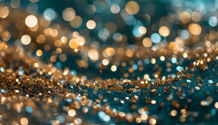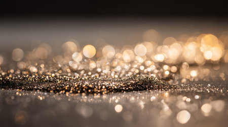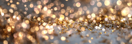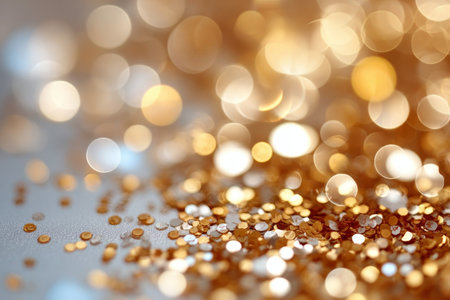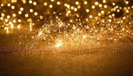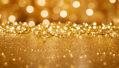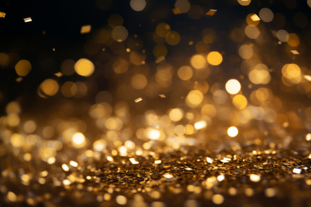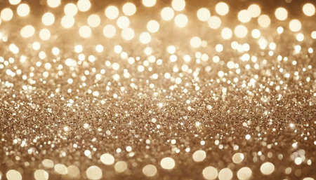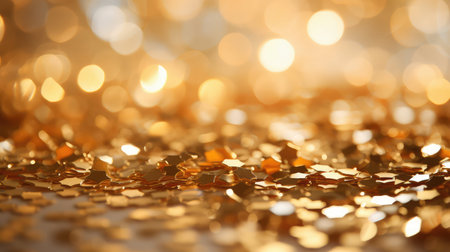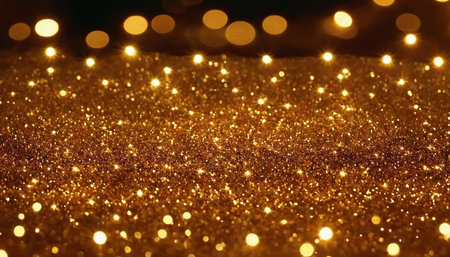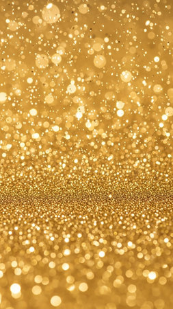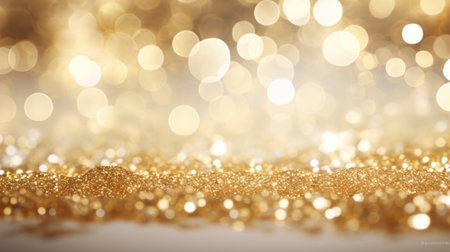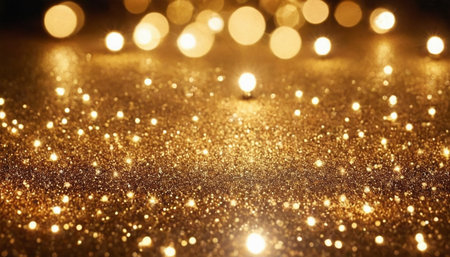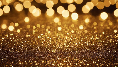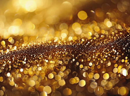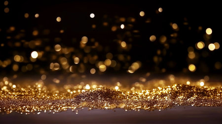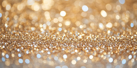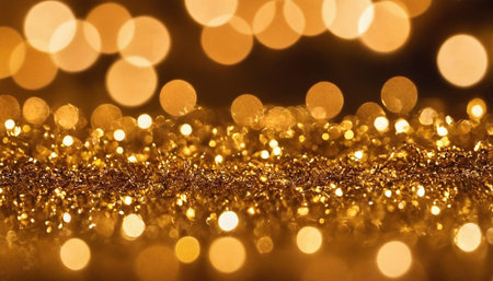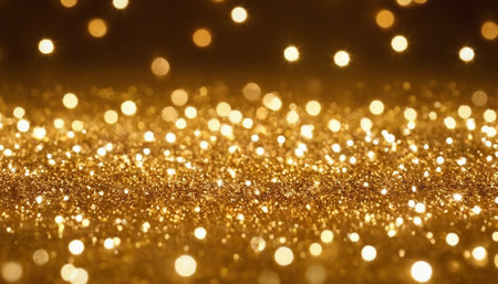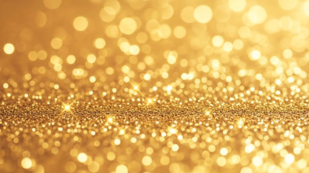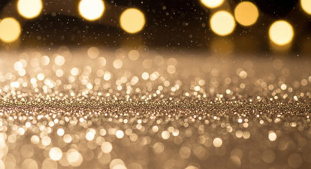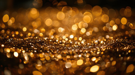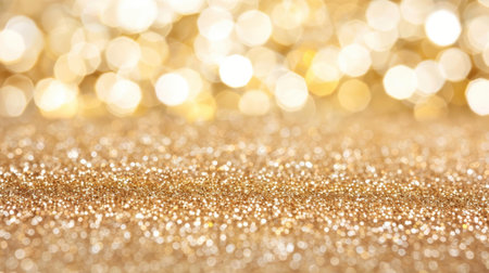 Year showing abundant golden glitter particles and soft bokeh lights create a shimmering background with a shallow depth of field effect and a sense of celebration...
